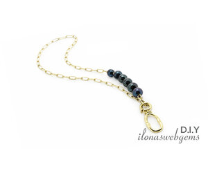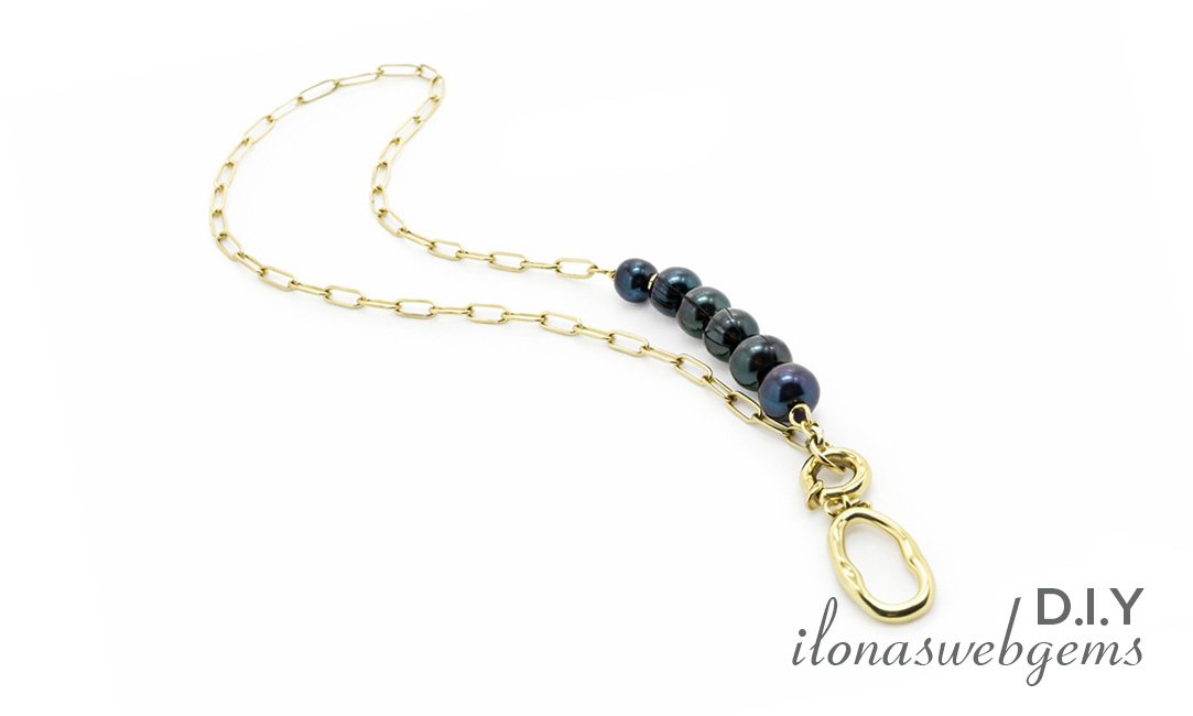 Schwarze Süßwasserperlen mit hochwertigen, vergoldeten Beschlägen, wie der Gliederkette und dem Klickverschluss, der gleichzeitig als schicker Anhänger dient.