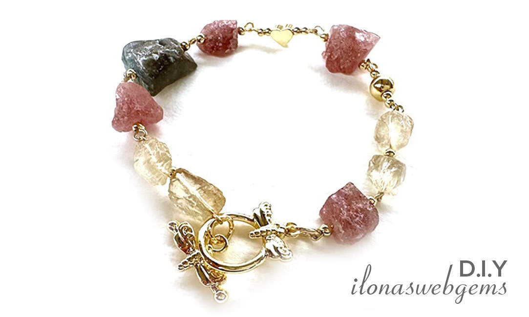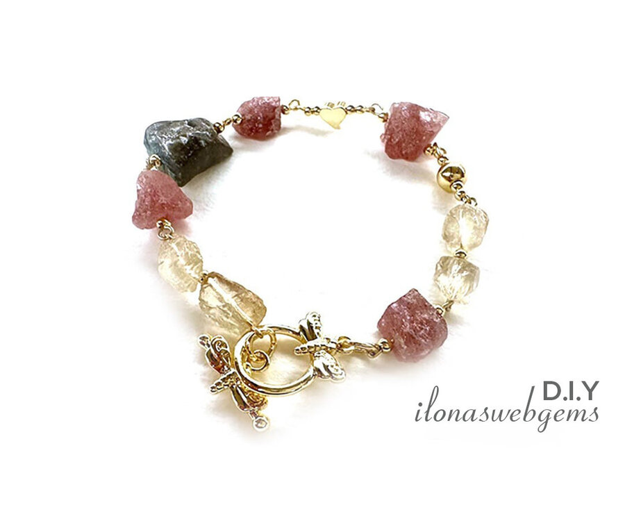 Mischung aus rohen Erdbeerquarz-, Bergkristall- und Labradoritperlen, mit hochwertigen, vergoldeten Fassungen