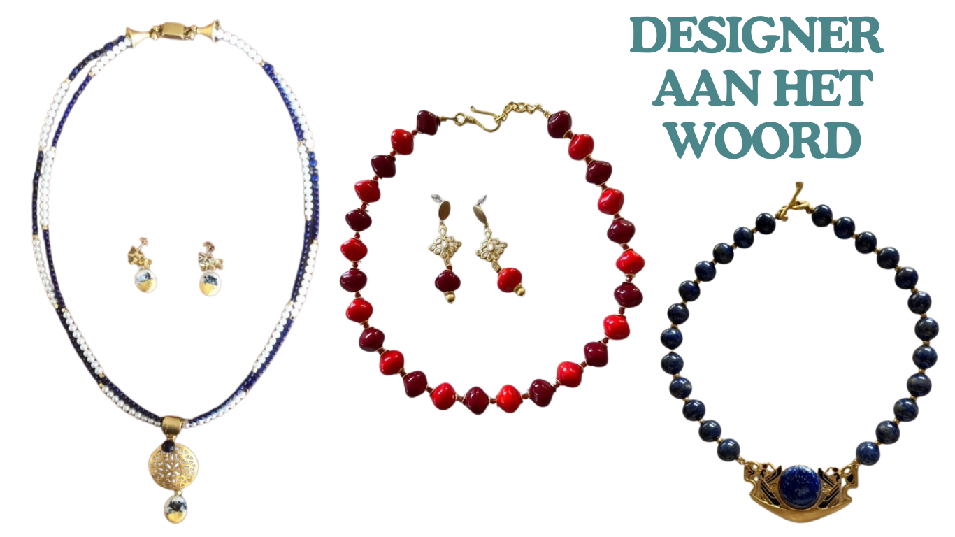 Haar favoriete stukken? “Een collier van grote onyx kralen met kleine zilveren kralen en een prachtige grote zilveren kraal als middenstuk vind ik echt bijzonder. Ook mijn set van Lapis Lazuli met vergulde details, compleet met bijpassende oorbellen, springt eruit,” zegt Madeleine. Ze combineert soms zelfs Murano glas kralen uit Italië met edelstenen van Ilona’s WebGems en zilveren of vergulde onderdelen voor een bijzonder effect.