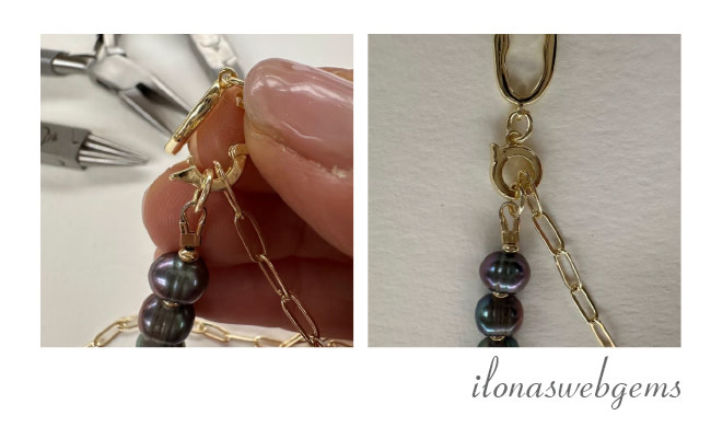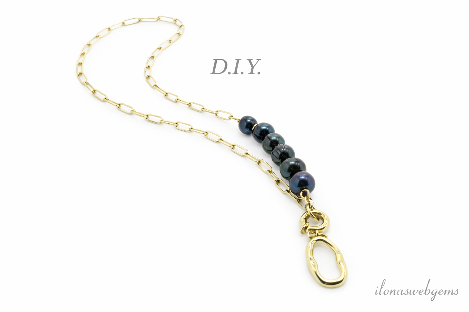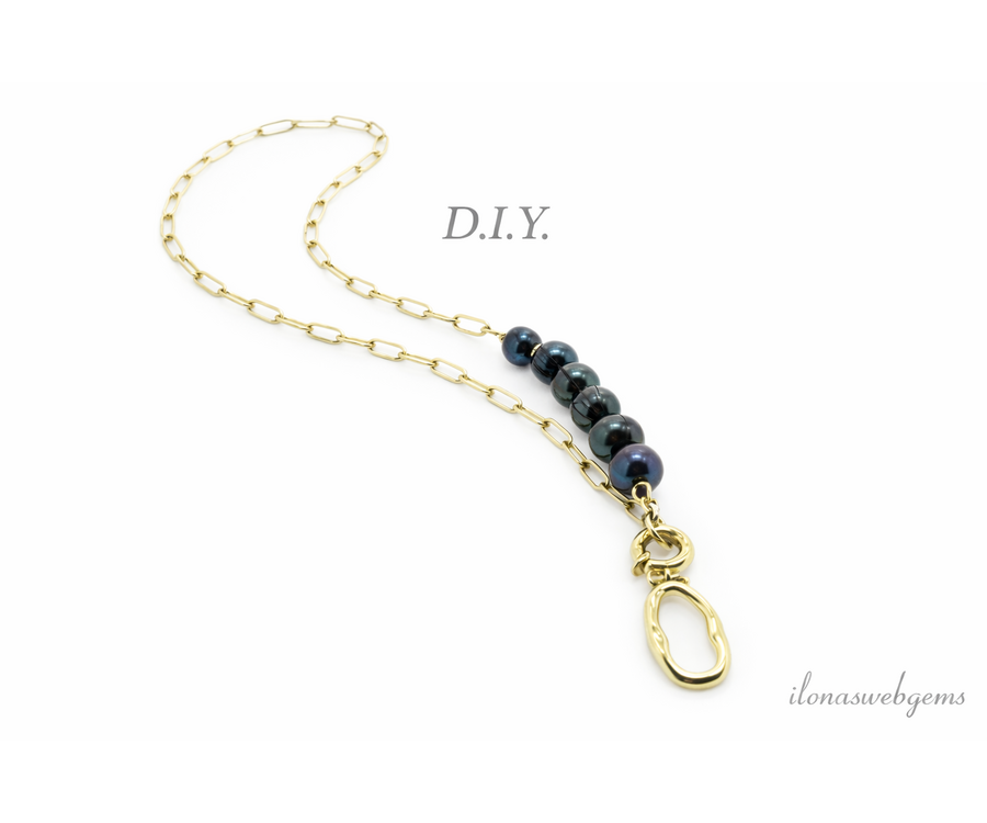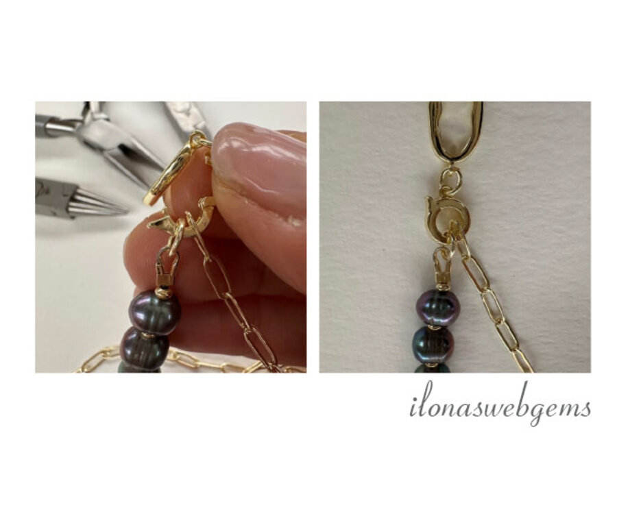 Zwarte Zoetwaterparels met Premium Gold Plated fournituren, zoals de schakelketting en het klikslot dat tegelijk een toffe hanger is.