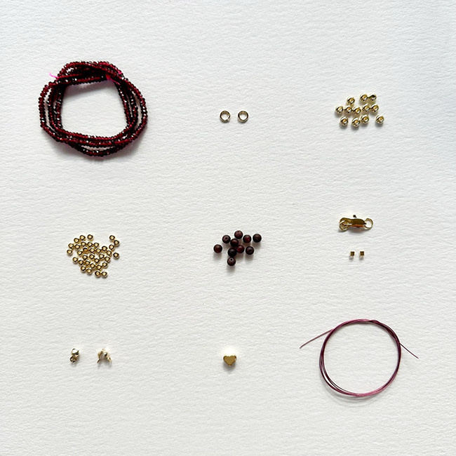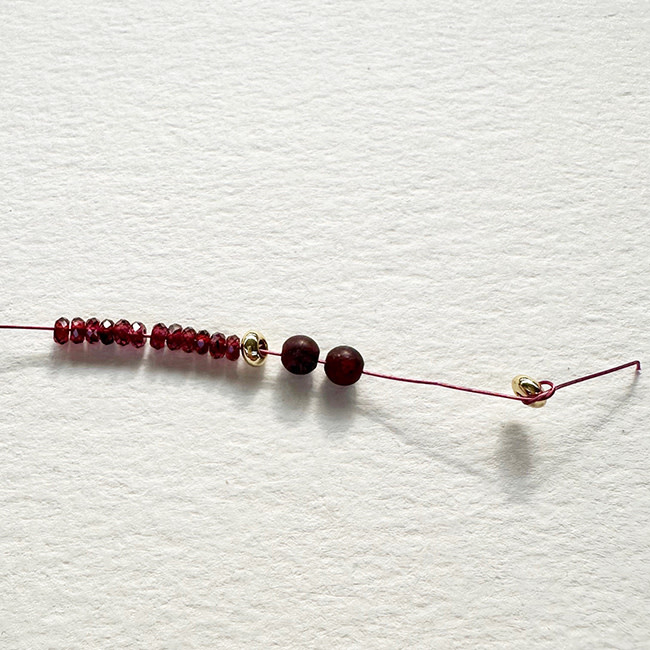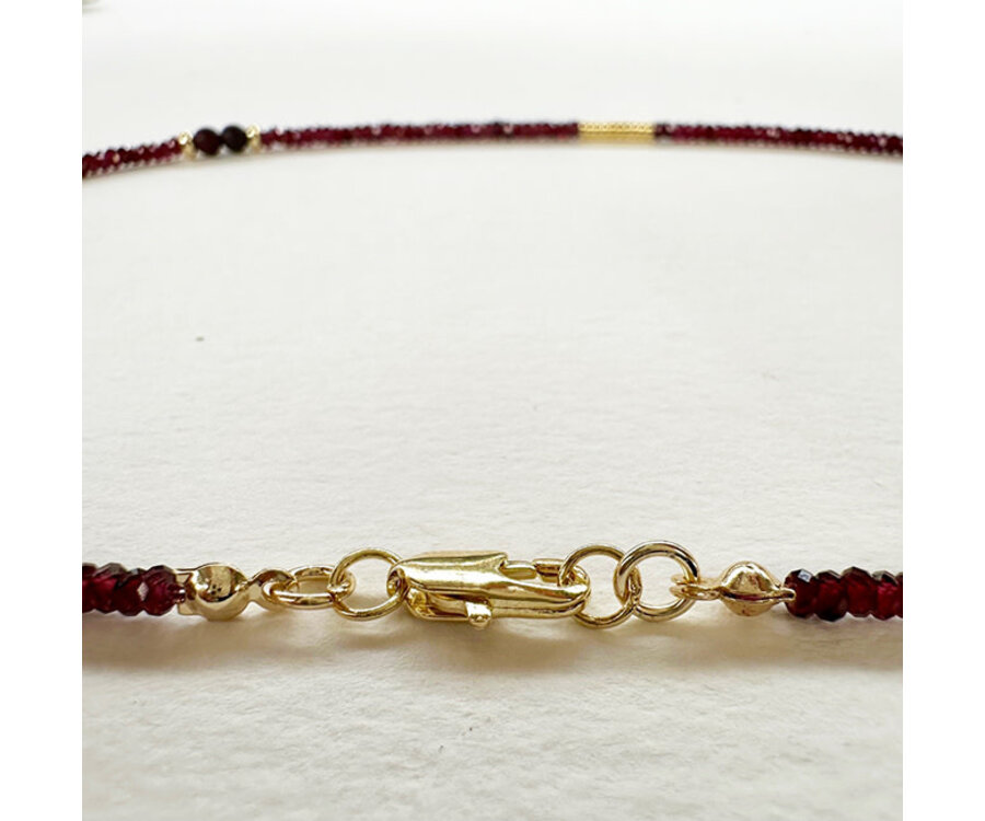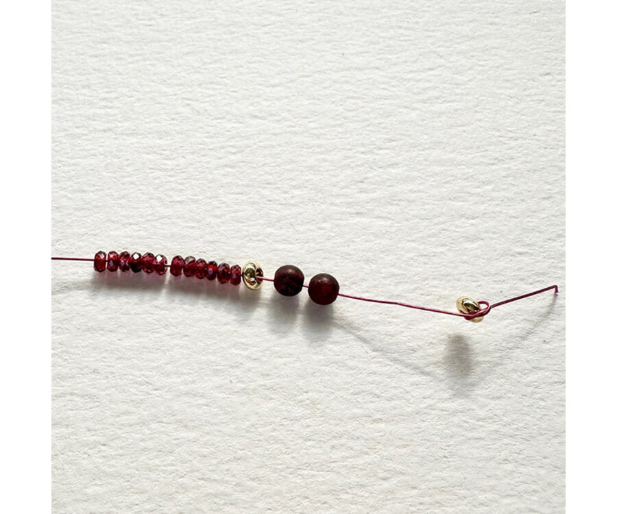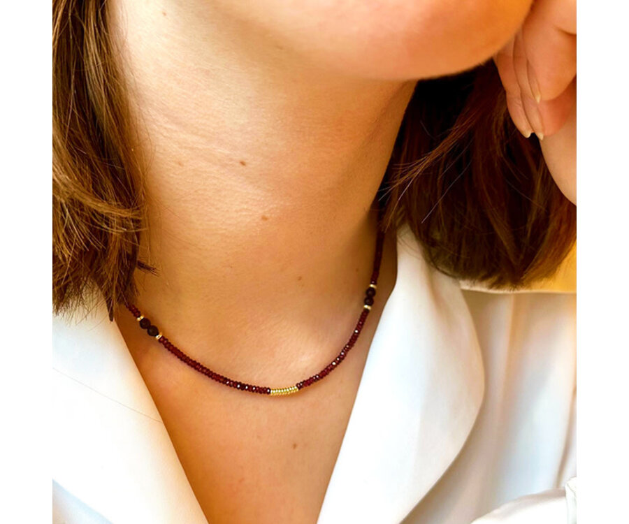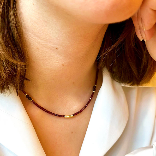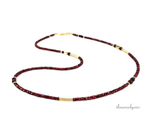Een combinatie van 3mm Granaat facet rondellen, 4mm matte Granaat kralen en Premium plated fournituren