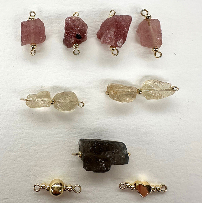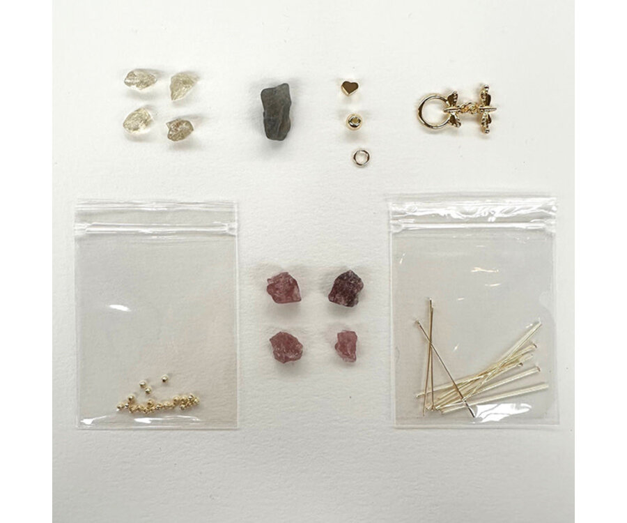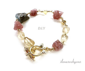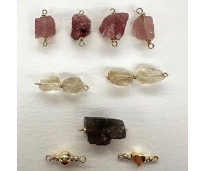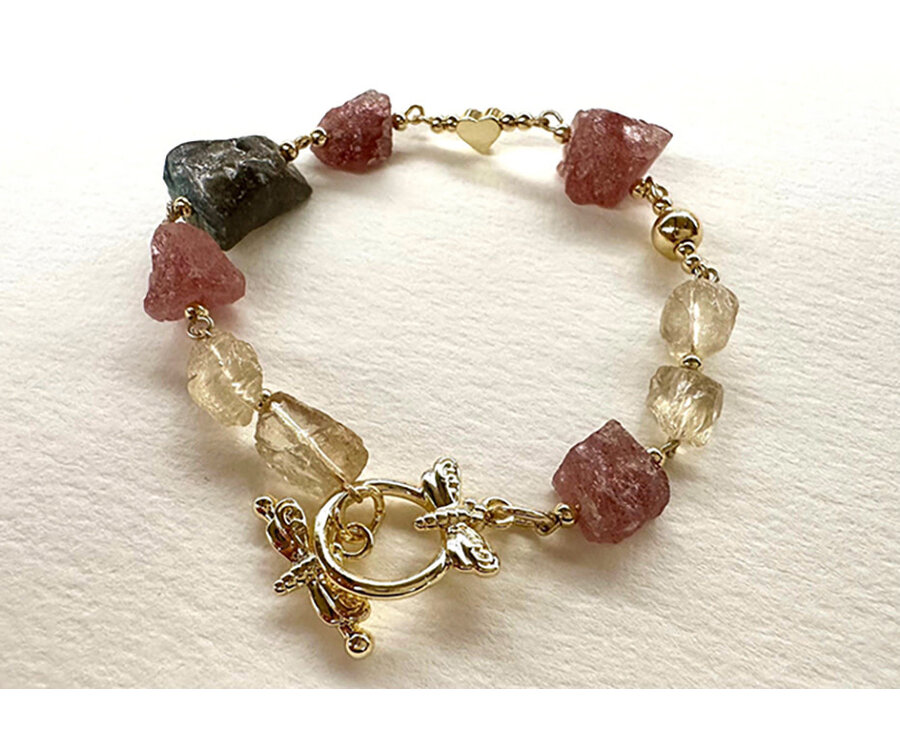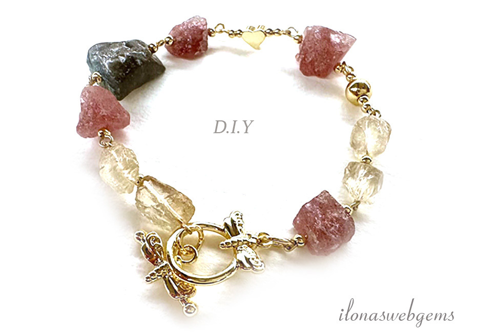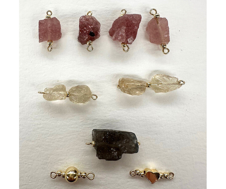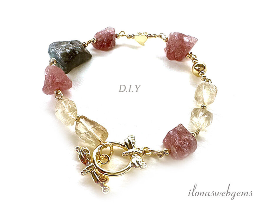 Mix van Aardbeienkwarts, Bergkristal en Labradoriet rough kralen, met Premium Gold Plated fournituren