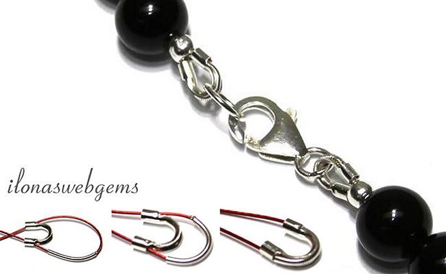 Knip je draad op de door jou gewenste lengte Neem ongeveer 5 cm extra draad voor de bevestiging van het slotje Rijg een knijpkraaltje op je draad Haal je draad door één kant van de beschermer en rijg een klein stukje bouillondraad mee (zie foto) Steek terug door je draadbeschermer Haak het slotje aan de draadbeschermer en steek vervolgens de draad terug door het knijpkraaltje Vastknijpen en klaar! Knip de draad niet direct na het knijpkraaltje af, maar rijg de draad nog even door een of wat meer kralen terug Het knijpkraaltje werk je mooi weg met een knijpkraalverberger