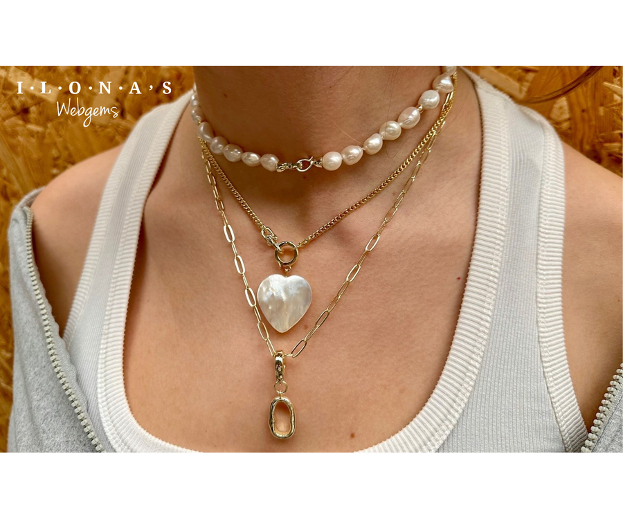 Echte Zoetwaterparels, een Parelmoer hart en Premium goldplated sieradonderdelen komen samen in een set met contrast, textuur en karakter. Stoer, vrouwelijk en met uitstraling.