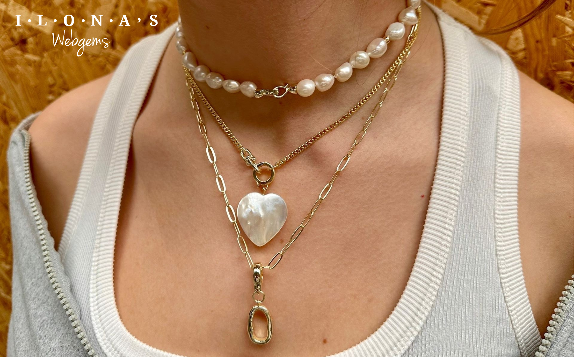 Echte Zoetwaterparels, een Parelmoer hart en Premium Gold plated sieraadonderdelen komen samen in een set met contrast, textuur en karakter.